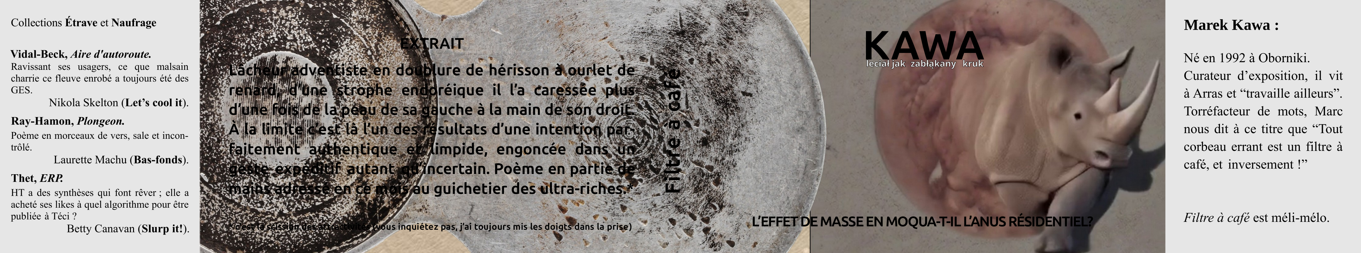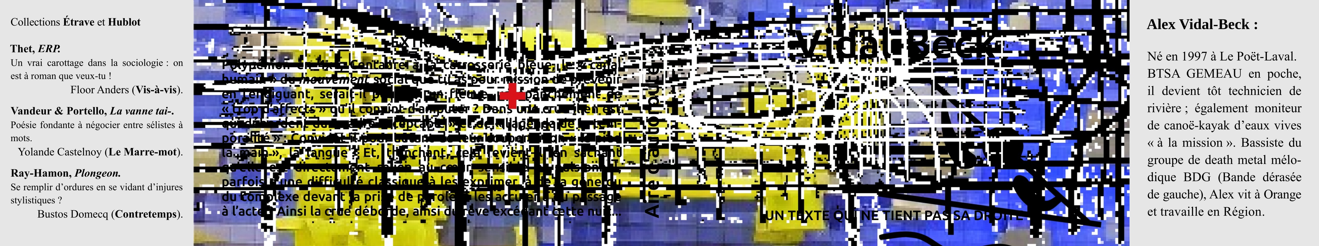 Enfin, pour consulter le bandeau d’éditeur, ouvrir le document intitulé « Boutique des goodies » en cliquant page 17 sur « âpre, et mécontent ». N.D.É. : Une fois n’étant coutume, il nous importe de préciser que cette « combine » explorant la bande dessinée mean (sic) stream de Luzerne a été retenue dans la haute tradition du valentinage : un coup de cœur annuel par lequel, dérégulés, la langue est transformée en cep de vigne et l’utérus en dragonneau (Dracunculus murgelensis). Nicolas Lally 🔍 Pour écouter le fichier son intitulé « Poésie confesse avec deux vers en hyperprécarité sans additif notable », cliquer page 13 sur « deux nuages antenais ». Pour ouvrir le document intitulé « Floculation de poème aux effluves de merguez », cliquer page 18 sur « alors casse-toi de là », et, pour le document intitulé « Plafond de vers et rimes en collant moulé sur la quenelle à Queneau », page 21 sur « floraison solaire ». Enfin, pour consulter le bandeau d’éditeur, ouvrir le document intitulé « Taxidermiste de l’ombre chinoise » en cliquant page 26 sur « climat de l’urne bu ». N.D.É. : Réseau de vers démantelé, des milliers de rimes en « merdre » retrouvées dans le disque dur. Eulalie Ruynat 🔍 Pour écouter le fichier son intitulé « La danseuse et son nodule entre les fesses », cliquer page 9 sur l’épigraphe : « Voici venir le moment des regrets ». (Crédit audio à 32 % de texte et 100 % de son : Camille Cloarec.) Pour ouvrir le document intitulé « Lanceur de sonnettes », cliquer, pages 17/18, sur « poème entièrement ficelé d’art / poème neuf et non recyclé », et, pour le document intitulé « L’assez fait de ses affermissements », pages 21/22 sur « au cours des double-pages ; allant, han-han, activons le lithium / montage financier en asphalte et en béton ». Enfin, pour consulter le bandeau d’éditeur, en 4e de couverture ouvrir le document, intitulé « Les festivités de Célestin », en cliquant sur « On vous l’offre sur votre dépression ». Bonus. : batterie au sodium garantie à vie. « Liu Xiang apporta des preuves en écrivant les biographies de soixante et onze de ces immortels pour montrer que certains humains avaient vraiment réussi à dépasser la mort. » Étrave, à suivre… Amédée Pitte 🔍 Pour écouter le fichier son intitulé « Riot Catalog », cliquer page 13 sur « Valet au pantalon bleu fraîchement repassé, soleil ténu comme un félin épris d’espace ». (À coller là où vous les voulez, intitulés « Accropode » et « Attention marquée aux détails » : collage 1 et collage 2.) Pour ouvrir le document intitulé « De quelques peigne-culs à volte-face », cliquer page 14 sur « A roté ! », et, pour le document intitulé « IA de photos-souvenirs », page 18 ou page 26 sur « *TikTok* » et « *ReigNe* ». Enfin, pour consulter le bandeau d’éditeur, ouvrir le document intitulé « Dancing cats with ebook excerpt » en cliquant page 27 sur le mot « TABLE ». Crédit image : un document intitulé « Accropode on acoustic camera ». Vahina G. Nithal et Cathal Le Carzer 🔍 Pour écouter le fichier son intitulé « Désir hydrique et tonnelets », cliquer sur l’extrait en 4e de couverture : « c’est toujours sous une pression de la main qu’elle éjecte en renvois réguliers et par un effet de caléfaction soutenu un feu constant de confettis ». Pour ouvrir le document intitulé « Je mangerai les cendres de la génisse rousse avec l’avertisseur de brosse à chiots », cliquer page 17 sur trois des mots de la note (au catalogue spécifiée « du chapitre deux, recto ») ci-dessous, ceux mis entre parenthèses : « lieu d’aisance neuronal » (on y constate un seuil de constipation par antiphrase, et, sans viser personne alors que l’antre de l’œil perçoit parfaitement que c’est dur à sortir, une façon d’hypertension oraculaire au niveau des muscles fessiers, ceux-là même qui font à notre lalangue un vachard et fier sourire abscons), et, pour le document intitulé « Otarie de siphon », page 23 sur « le sourire borné ». Enfin, pour consulter le bandeau d’éditeur, en 1re de couverture, ouvrir le document intitulé « Répertoire des fausses identités » en cliquant sur « Brosse à chiottes ». Note du chapitre deux, recto : l’autre il avait une « étoile », il est né mort-vivant dans les petites lèvres de sa reum, la « reine » ou la « fée » qu’il écrivait dans un petit écrin – mal reprisé, comme ses chaussettes en accordéon dans ses godillots – de forme sornette et la bobinette cherra. En bonus, la vignette de la page 26 où que le GMT der große böse Wolf y est pas ! Zohra Tahar-Dalric 🔍 Pour écouter, en 4e de couverture, enclos comme à mouche la pupe au deuil d’un tout dernier asticot, le fichier son intitulé « Chose enroulée », cliquer sur « blondasse bien claire façon Française ». (À l’école en stop sur la route de l’usine à chaux.) Pour ouvrir le document intitulé « Mon pappy en Éhpad et sa rustine express », cliquer page 14 sur « réflexe du doigt sur un clic », et, pour le document intitulé « Boyaux (Pour s’y retrouver dans la carte de la Garbarite aiguë !) », page 5 sur « Un mot d’elle ». Enfin, pour consulter le bandeau d’éditeur, ouvrir le document intitulé « Portique à vélocité » en cliquant page 21 sur « du blanc Bicot quoi, du blanc bougnoule ». Merci aux Éditions Le Lièvre et à Conrad Uebbing pour le texte du fichier son, un laboratoire intitulé L’ère des grands craquements. Uhaina Buztingorri 🔍 Pour écouter le fichier son intitulé « C » (Piaulement de renards sous le perchoir), cliquer page 22 sur « La langue lui tire à la coq- (retour à la ligne) uille, hein. ». Pour ouvrir le document intitulé « O » (Zer da baselina-tranpa bat?), cliquer page 15 sur « gros » (en caractère gras dans la loupe, où l’on n’y voit 